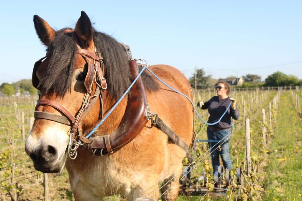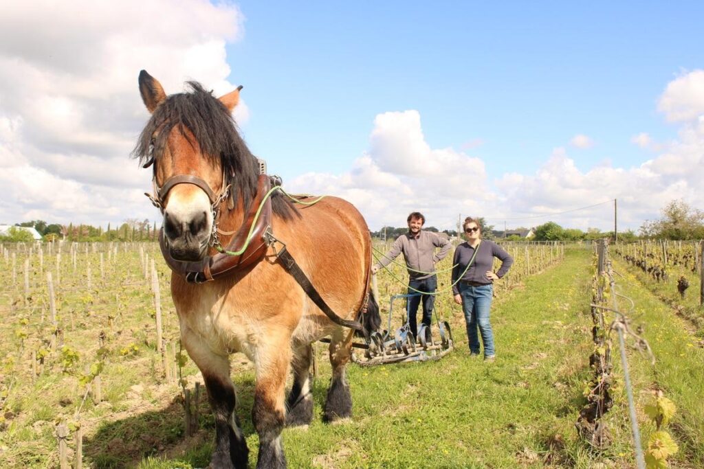 Au cœur des coteaux du Maine-et-Loire, Jeanne Germain et Florent Bouvet ont mis le pied à l’étrier avec Ben et Comtesse, deux Ardennais de 900 kilogrammes. C’est avec ces deux gros bébés qu’elle et il cultivent six hectares de vignes près de Saumur. Fille de viticulteur, Jeanne s’est lancée en 2019 avant d’être rejointe par Florent deux ans plus tard. Ancienne vendeuse de vin, elle s’est reconvertie dans un métier qui liait ses deux passions : le cheval et la terre. «J’ai passé une formation d’un an pour avoir un certificat de spécialisation d’utilisateur de chevaux attelés qui a été financée par le Conseil régional, retrace Jeanne Germain pendant que son Ardennais fait une pause. J’ai tout de suite eu du boulot dans les vignes de mon père. Aujourd’hui, on refuse des chantiers, car on a trop de demandes».