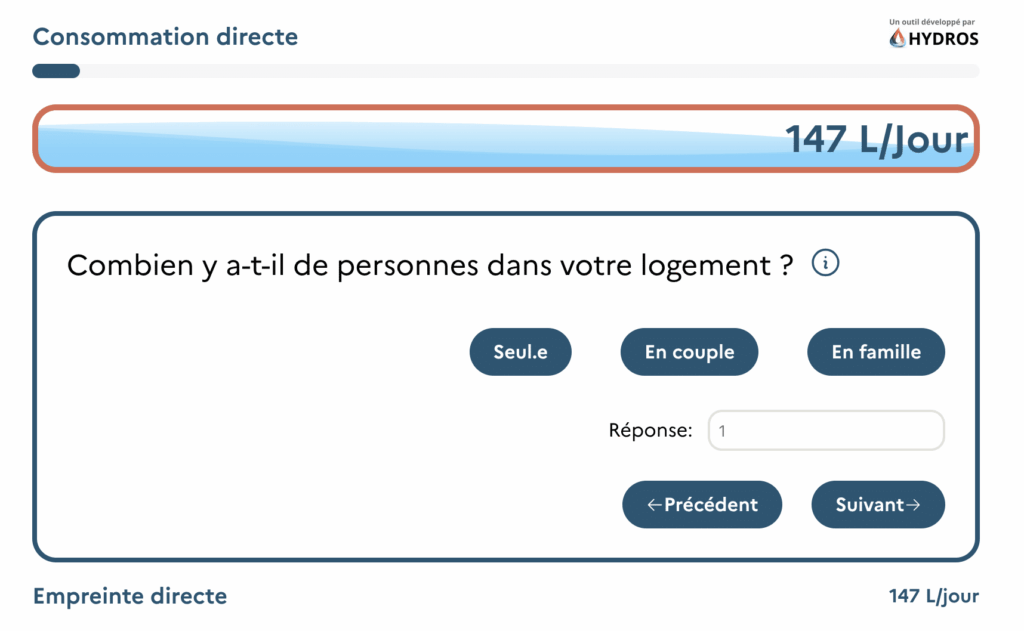 Le site permet de se comparer à la moyenne nationale (6 000 L par Français·e par jour) ainsi qu’à celles d’autres pays (3 000 L pour l’Inde et 7 800 L pour les États-Unis). Si vous utilisez environ 4 000 L d’eau par jour, cela revient à 34 piscines individuelles par an et 2 686 bouteilles au quotidien.
