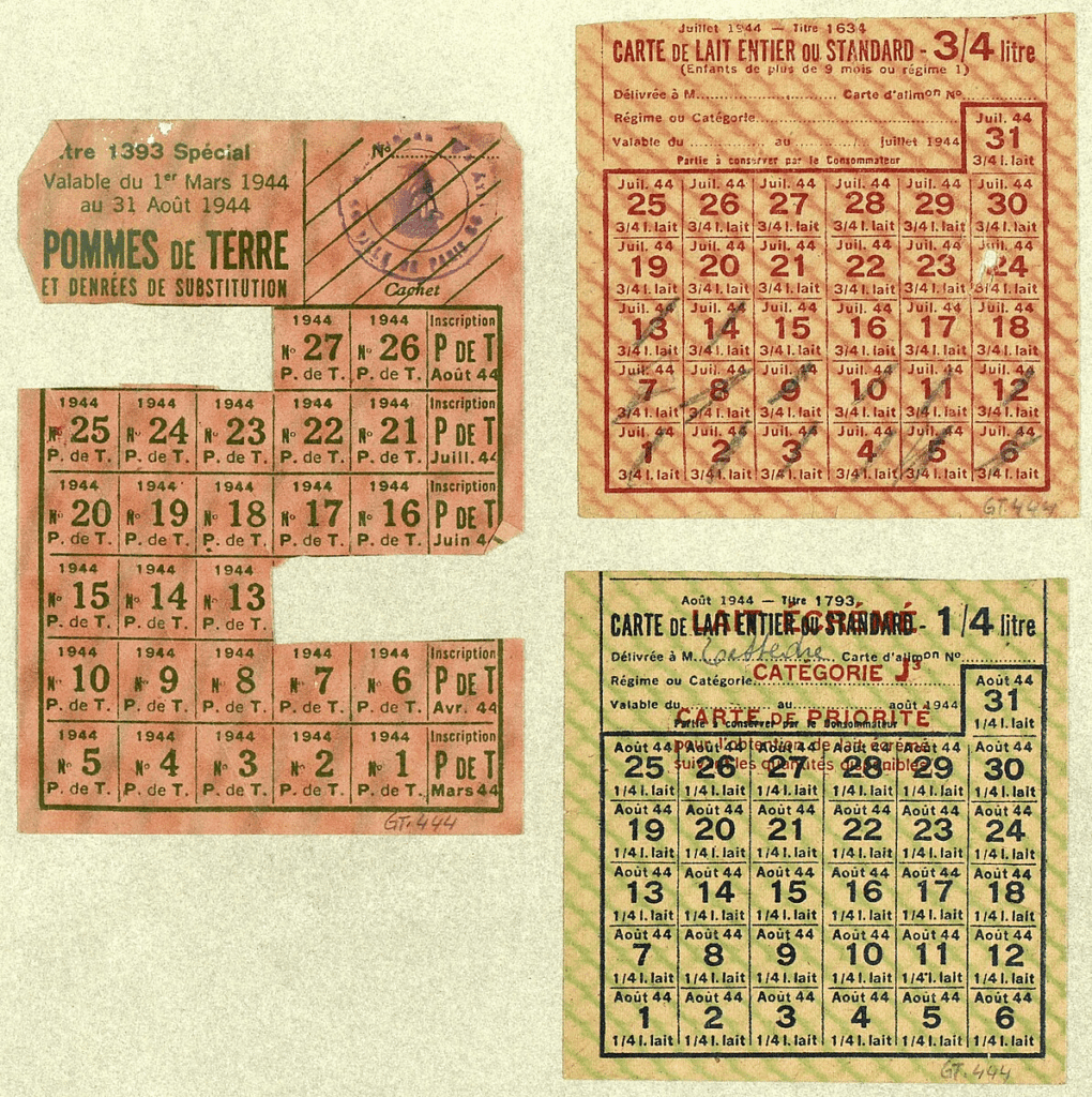 Voici ce à quoi a droit un·e Parisien·ne, via un système de coupons distribués par les autorités pour garantir un apport alimentaire minimal : 275 grammes de pain par jour ; 350 grammes de viande avec os par semaine ; 200 grammes de riz, 500 grammes de sucre et 250 grammes de pâtes par mois…