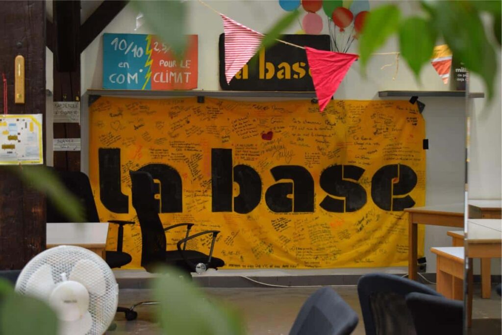 Ce tiers-lieu aux multiples fonctions est né en 2019, poussé par l’essor du mouvement Alternatiba Paris et par la dynamique entraînée par les marches mondiales pour le climat en 2018. Grâce au concours de nombreuses associations (ANV-COP21, Le mouvement, Action climat Paris, Utopia, le G.a.n.g), les activistes ont réussi à louer un bâtiment de 700 mètres carrés pour créer la Base, acronyme de « base d’action sociale et écologique ».