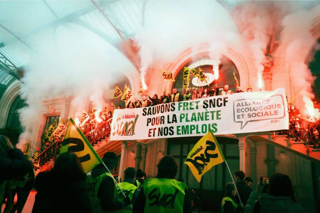 L’an dernier, la convergence entre écologistes et syndicalistes est entrée dans une nouvelle dimension avec la défense du fret ferroviaire public. Sous la pression de la Commission européenne, le gouvernement français projette de démanteler Fret SNCF – qui gère le transport de marchandises par train – pour ouvrir le secteur à la concurrence privée. Menacés de perdre leurs acquis sociaux, les cheminot·es reçoivent le soutien de l’Alliance écologique et sociale.
