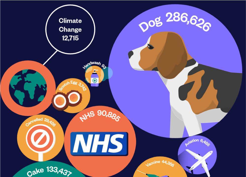 Autres termes qui devancent le climat : pique-nique (39 821 mentions) et Shakespeare (14 435). Vainqueur toutes catégories avec 286 626 occurrences : le chien.