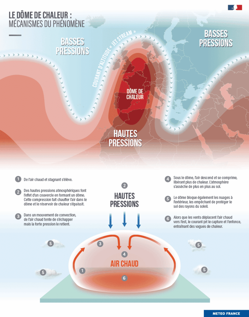 Les épisodes de canicule peuvent s’expliquer par la présence d’un «dôme de chaleur» au-dessus de la France. Cette situation météorologique est due à un blocage anticyclonique : de hautes pressions situées au-dessus de l’Europe de l’Ouest qui «emprisonnent de l’air chaud à tous les étages de l’atmosphère», explique Météo-France.