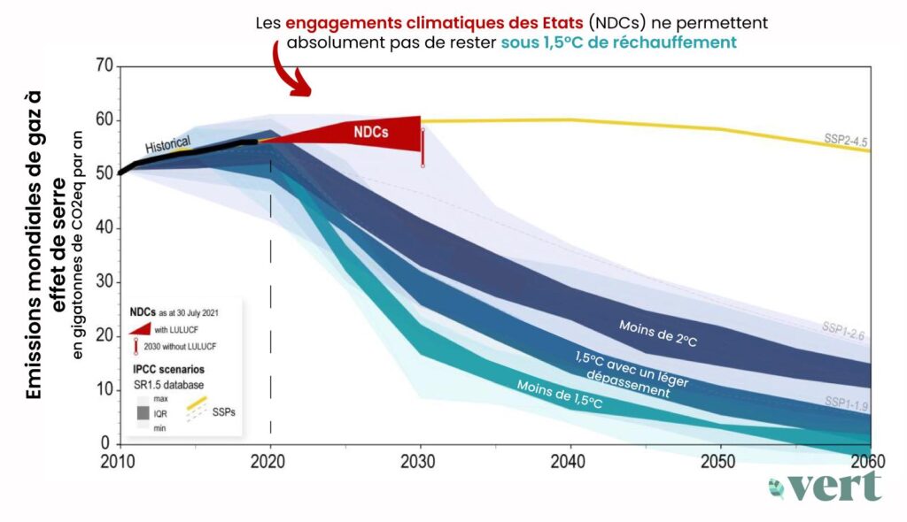« Ils ont eu 30 années de blabla et où cela nous a-t-il mené ? ». La question a été posée hier Greta Thunberg lors du sommet des Jeunes sur le changement climatique organisé par les Nations unies à Milan (Le Monde). La réponse, en image, est apportée par l’ONU elle-même. Ce graphique est tiré du bilan sur les engagements climatiques des États (appelés NDCs) paru mi-septembre. Malgré les beaux discours, les promesses des Etats nous emmènent sur une trajectoire d’émissions de gaz à effet de serre (en rouge) dangereusement supérieure aux recommandations des scientifiques pour limiter la catastrophe climatique en-dessous de 1,5°C (bleu clair) et même à 2°C (bleu foncé). Avec les NDCs actuelles, le réchauffement atteindrait 2,7°C d’ici la fin du siècle. Pourtant, ce ne sont pas les promesses qui manquent, à quelques semaines de la 26è Convention de l’ONU sur le climat (COP26). « Planète bla-bla, bla-bla-bla, bla-bla-bla, l’économie verte bla-bla, la neutralité carbone en 2050 bla-bla », s’est moquée Greta Thunberg. Les faits, eux, ne mentent pas.