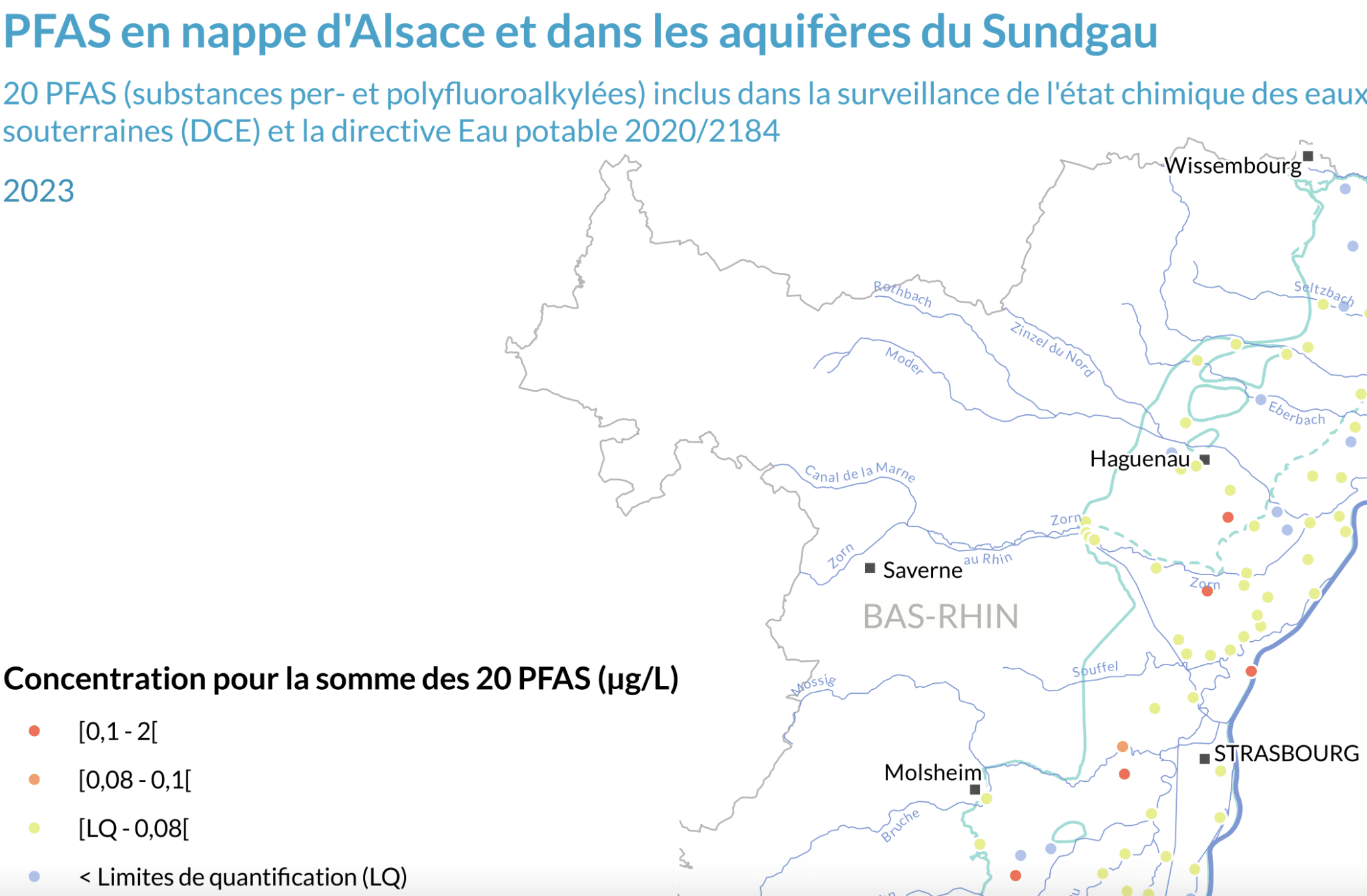 Dans un sous-volet de son étude, l’Aprona a recherché la concentration de ces 20 PFAS dans la nappe alsacienne. Les résultats révèlent la présence d’«au moins un des 20 PFAS analysés dans […] 91,2 % des échantillons», mais dans des concentrations inférieures à 0,1 μg/L dans une large majorité des cas (80%).