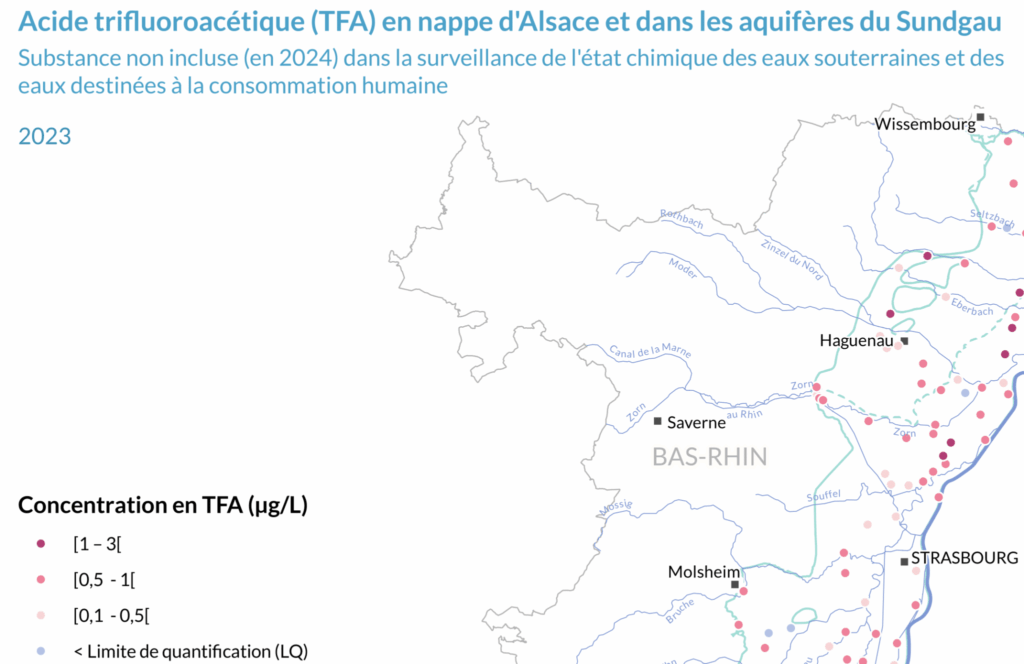 Cette substance chimique est issue de «de rejets industriels directs, des eaux usées et de la dégradation de gaz réfrigérants ou de pesticides fluorés», selon le rapport de l’Aprona, publié le 26 novembre dernier. Les résultats montrent que le TFA est présent dans 195 des 200 échantillons prélevés dans la nappe phréatique alsacienne (soit 97,5%), à un taux supérieur à 0,1 microgramme par litre (μg/L).