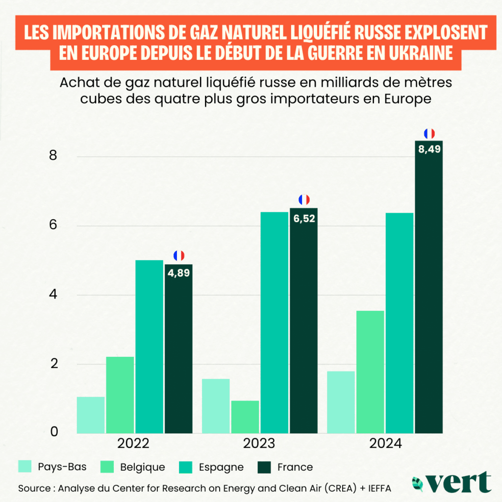 «La France, TotalEnergies et les banques françaises entretiennent des liens étroits avec l’industrie gazière russe», explique à Vert Anna-Lena Rebaud, chargée de campagne gaz fossile & transition juste pour l’association de défense de l’environnement et des droits humains Les Amis de la Terre. Notre pays fait partie, avec la Belgique et l’Espagne, des États dotés en infrastructures capables de recevoir et de traiter le gaz russe. Ces trois pays sont en tête de ceux qui en reçoivent le plus, pour leur propre consommation et pour la réexportation, en Allemagne par exemple.