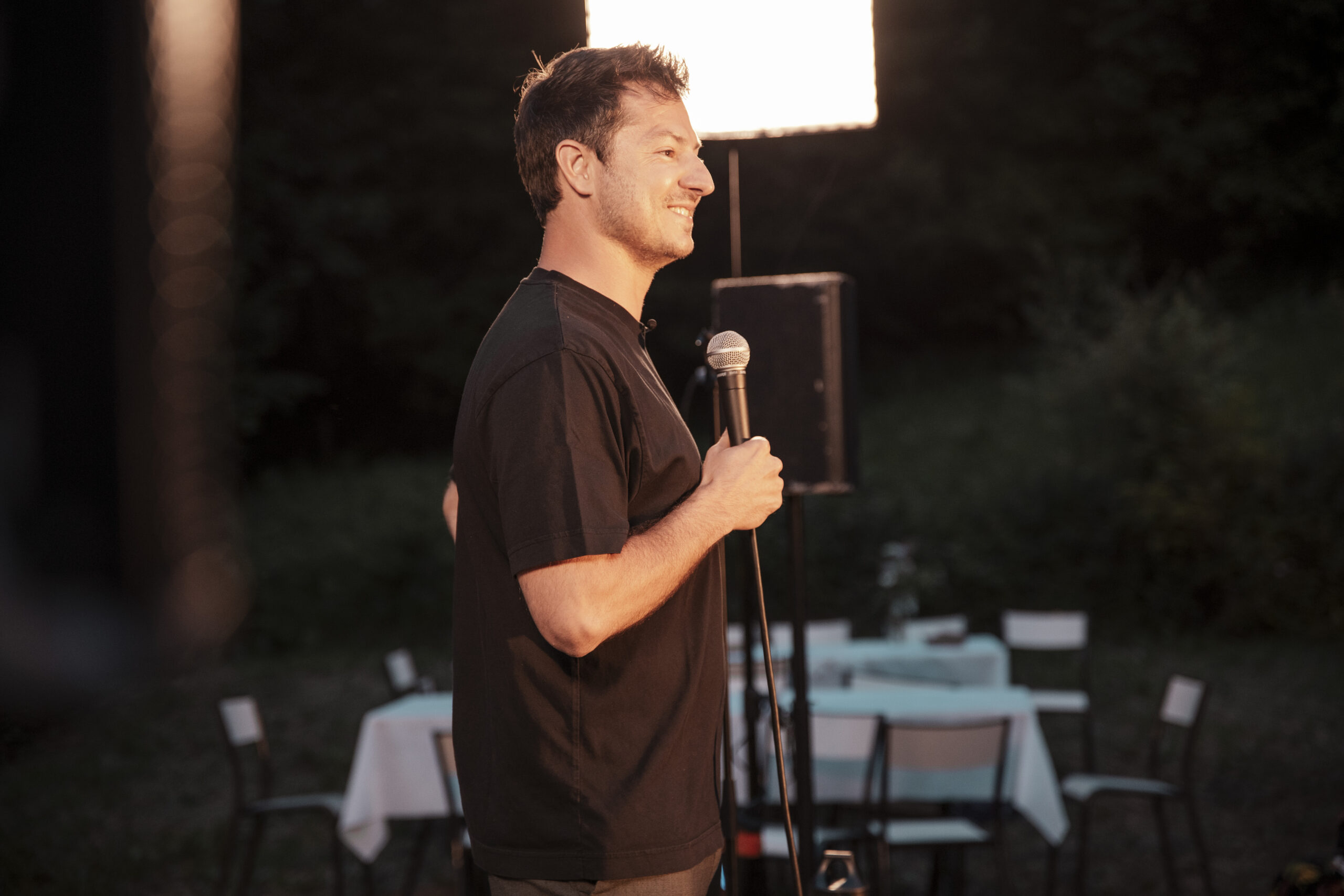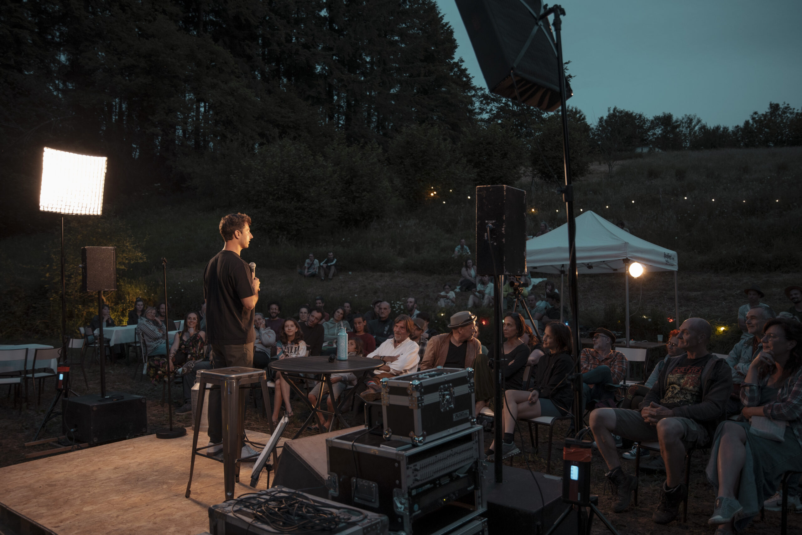Au fin fond du Tarn, c’est à la ferme «Lou Claus» que Nicolas Meyrieux donne son spectacle pour la quatrième date de son Farm Tour : une tournée des exploitations agricoles du pays qui a commencé dans les Pyrénées-Atlantiques le 4 juin. Entourée d’arbres fruitiers qu’Hugo Puech, le propriétaire des lieux, transforme en sirops, sorbets et confitures, la petite scène se tient prête à accueillir la cinquantaine de personnes attendues ce vendredi 7 juin. Tout l’après-midi, l’humoriste a parcouru l’exploitation, caméra à la main, pour écouter les histoires et les techniques agricoles du jeune agriculteur. Alors que le public commence à arriver, à deux heures de monter sur scène, l’humoriste se repose devant un sirop de fraise fabriqué à la ferme et se confie à Vert.