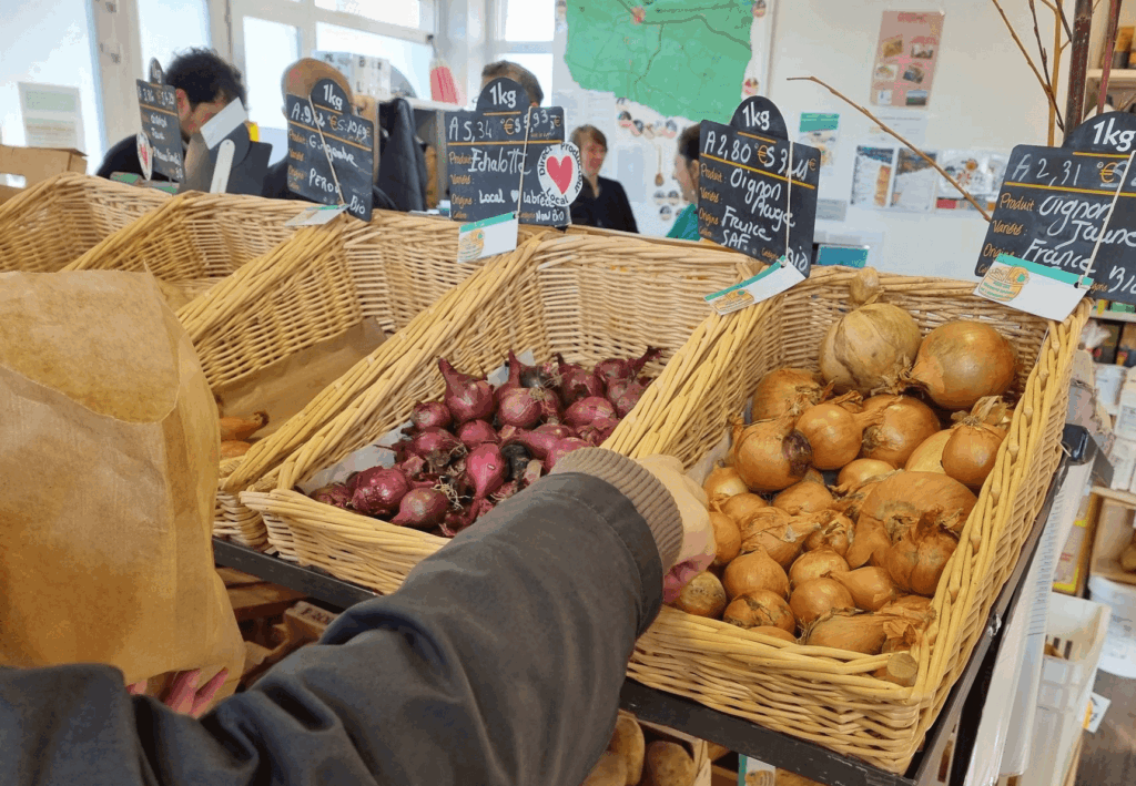 Sur les longues routes de la campagne bordelaise, entre pins et vignobles, la Sécurité sociale de l’alimentation (SSA) prend racine dans certains commerces solidaires. Dans l’épicerie participative La Coopé, au cœur de la petite ville de Langon au sud de la Gironde, de discrètes étiquettes vertes marquées d’un panier garni ont récemment fait leur apparition sur certains étals.