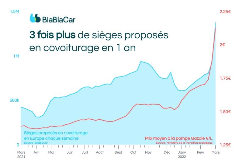 Jeudi, le site spécialisé BlaBlaCar a annoncé avoir constaté « un pic sans précédent » du nombre de sièges proposés aux utilisateur·rices en mars 2022 : 36 millions de voyages ont été mis en ligne par les conducteur·rices, soit une hausse de 227 % par rapport à mars 2021. Le succès est au rendez-vous en France comme en Allemagne, en Espagne et en Italie, assure l’entreprise leader du secteur (AFP). Même constat pour l’application de partage de trajets domicile-travail Karos, qui a enregistré une hausse des inscriptions de 231 % au début du mois de mars par rapport au mois précédent.