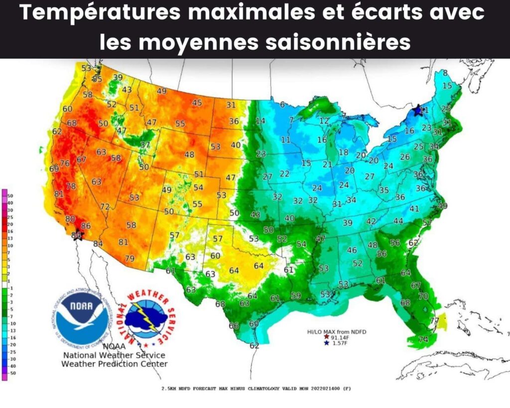 Les écarts aux maximales moyennes de saison relevés dimanche 13 février, indiqués en degrés Fahrenheit © National Weather Service Weather Prediction Center
