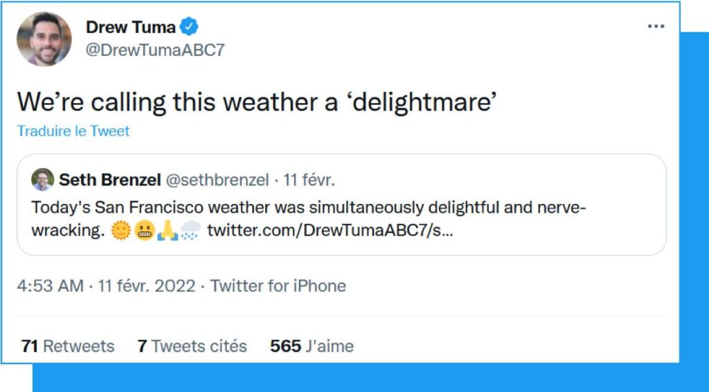 Sur les réseaux sociaux, les internautes ne savent plus s’ils doivent profiter du beau temps ou s’inquiéter de ces températures anormales. Le météorologue de la chaîne de télévision locale KGO-TV, Drew Tuma, a inventé le terme de « delightmare » (« delight » et « nightmare », soit un cauchemar délicieux) pour qualifier la situation.