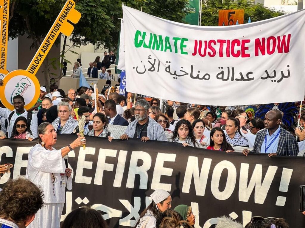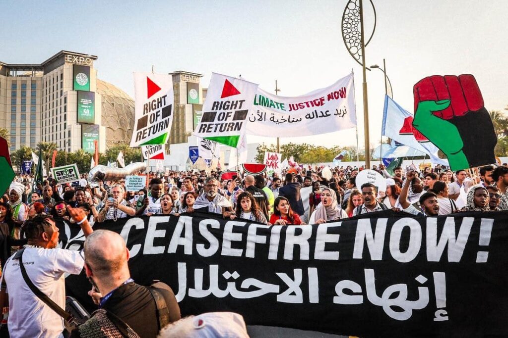 Cette COP se déroule dans un contexte particulièrement inflammable, alors que la guerre fait rage à Gaza. Puisqu’elles estiment qu’il n’y a «pas de justice climatique sans droits humains», comme elles le scandent ce samedi après-midi, les organisations de la société civile réclament un cessez-le-feu immédiat dans chacune de leurs actions – ou presque.