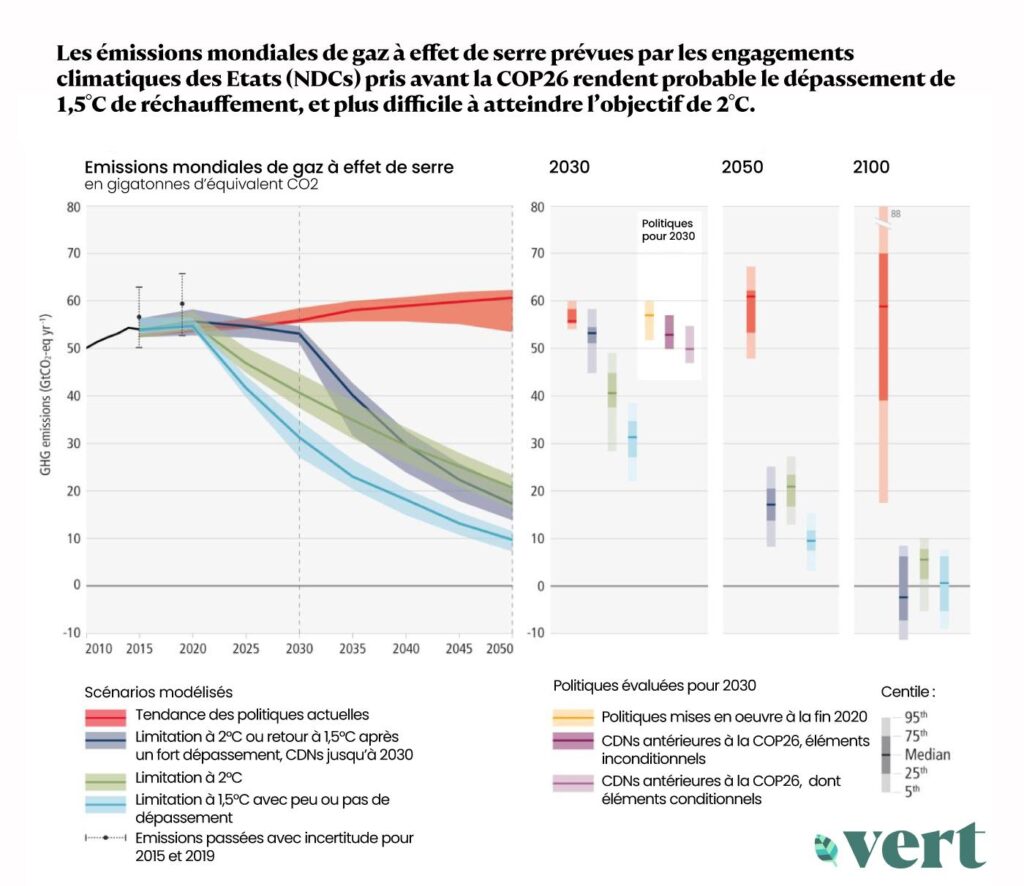 Des politiques et mesures de réductions sont maintenant en vigueur dans de nombreux endroits du monde et secteurs d’activités, et elles ont permis d’éviter certains rejets de gaz à effet de serre. Malgré cela, les émissions mondiales sont encore et toujours à la hausse, atteignant leur plus haut niveau avec 59 milliards de tonnes (59 gigatonnes) de CO2-équivalent relâchées en 2019. En outre, comme l’a récemment dévoilé l’Agence internationale de l’énergie, après une brève accalmie due à la pandémie, les émissions ont bondi de 6 % entre 2020 et 2021. C’est un nouveau record (Vert). « Nous sommes sur la voie rapide vers le désastre climatique », a averti António Guterres, secrétaire général des Nations unies, ce lundi.