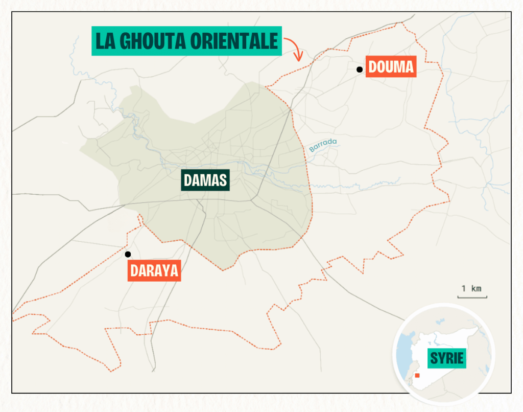 Sur la route qui mène de Damas à Douma, dans la Ghouta orientale, en Syrie, les champs de ruines défilent à perte de vue. Ghouta, en arabe, signifie oasis. Autrefois, une ceinture de verdure entourait la capitale syrienne : la majorité des fruits et des légumes y étaient cultivés. Au fil des années, celle-ci est devenue béton en raison d’une urbanisation galopante dès les années 1960. Pendant plus de 54 ans, les Assad, père puis fils, ont dirigé le pays d’une main de fer. En 2011, une révolution pacifique a éclaté dans le pays. La répression d’Assad fils a fait jaillir un bain de sang. Sur l’autel de l’ordre, des milliers de Syrien·nes ont été sacrifié·es et avec elles et eux, leurs terres et ressources naturelles.