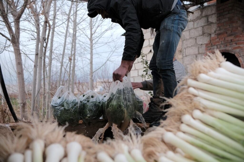 Un petit ruisseau, encombré de déchets, coule du champ. Malgré la saison hivernale, seul un filet d’eau le traverse. «Les principales sources qui existaient autrefois en Ghouta ont été coupées pendant la guerre pour assécher la région», continue Mohammad Fatoum, entouré d’autres paysans. À mesure que les frappes et les bombardements s’intensifiaient dans la région, l’accès à la terre se réduisait. «Pendant la guerre, nous avons utilisé de petits espaces pour cultiver des légumes, du blé et de l’orge pour la consommation quotidienne», explique l’agriculteur. Mais les bombardements ont empêché les cultures de pousser, selon ce dernier, conduisant à la mort de nombreux·ses civils, dont des enfants, morts de froid et de faim.