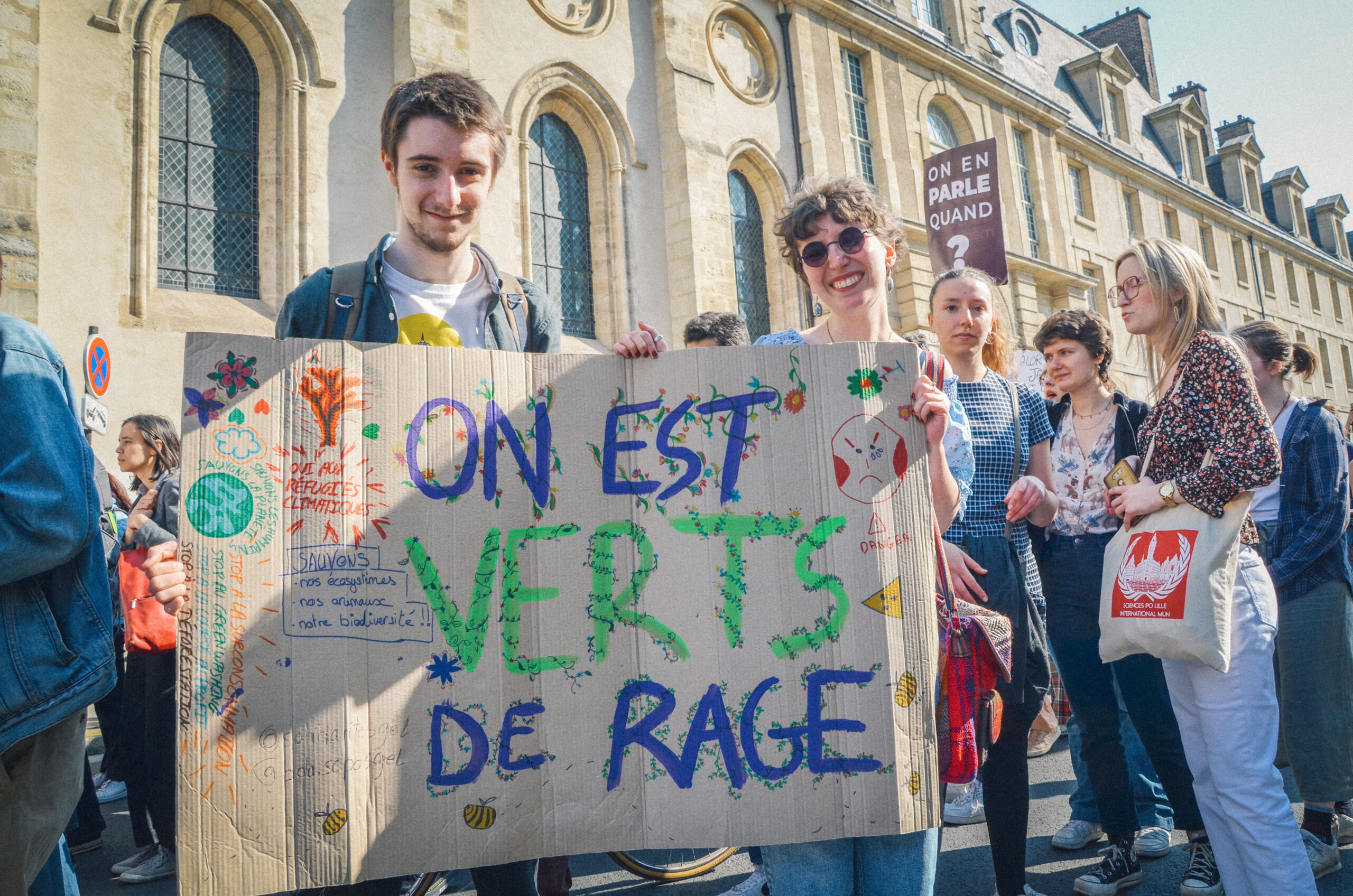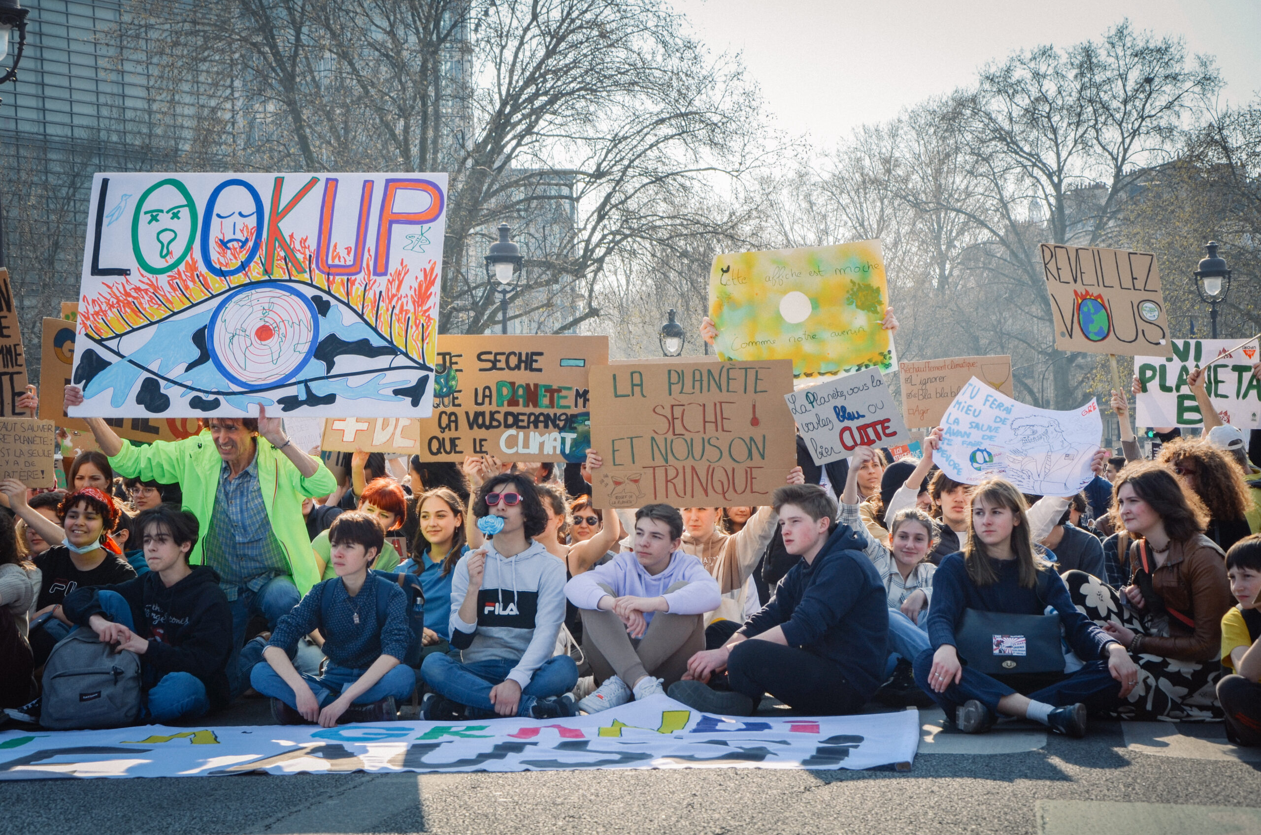 Devant le Panthéon où sont enterrés « les grands Hommes de la Nation », quelques centaines de lycéen·es et étudiant·es se sont rassemblé·es cet après-midi pour redonner un souffle aux grèves du vendredi pour le climat, initiées en 2018 par la Suédoise Greta Thunberg. Venu·es avec leurs ami·es, parfois avec leurs professeur·es, elles et ils peaufinent leurs pancartes sur le parvis. On peut y lire : « Papa, désolée, je sèche pour la planète » ou encore « Portrait de la jeunesse en feu ». Quelques parents sont venu·es avec leurs jeunes enfants, et sont également présents le syndicat Solidaires, plusieurs organisations écologistes dont Alternatiba Paris, Greenpeace et Sortir du nucléaire, ainsi que le cinéaste Cyril Dion et le candidat des Verts à la présidentielle, Yannick Jadot.