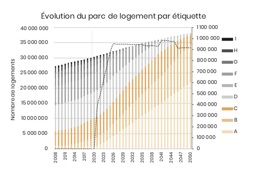 À ce jour, la loi de transition énergétique pour la croissance verte de 2015 et la loi énergie et climat de 2019 fixent que l’ensemble du parc de logements soit rénové pour 2050 au niveau bâtiment basse consommation (BBC – d’après la réglementation thermique française RT2012, la consommation énergétique des BBC doit être inférieure de 80 % à la consommation normale règlementaire). Elles exigent aussi que tous les logements à consommation excessive d’énergie (classes F et G) soient rénovés avant 2028.
