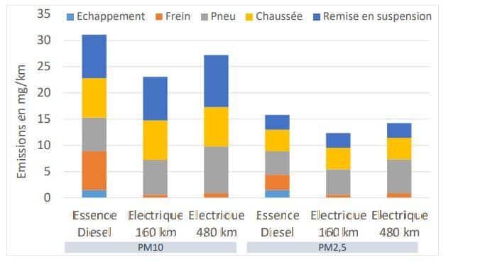 La voiture électrique échoue pour l’instant à supprimer les pollutions de l’air et sonores liées à l’automobile. À force de progrès sur la réduction des particules fines à l’échappement, la majorité de la pollution de l’air provoquée par les voitures provient désormais de l’usure des freins, du frottement des pneus sur la chaussée et de la remise en suspension de particules fines déjà présentes sur les routes. Grâce à une meilleure technologie, les véhicules électriques permettent de réduire les émissions de particules issues du freinage, mais augmentent les émissions issues des frictions pneus/chaussée de près de 14% et celles remises en suspension de 8% (en ce qui concerne les PM10, particules dont le diamètre est inférieur à 10 micromètres).