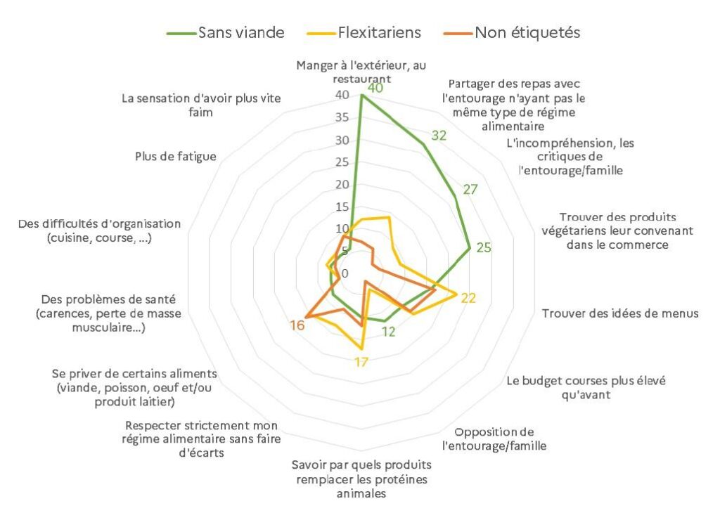 Malgré tout, seul·e·s 2,2% se passent aujourd’hui de viande (régime pescetarien, végétarien ou végétalien) même si 24 % limitent volontairement leur consommation (flexitariens). Les 74 % restants se classent parmi les omnivores qui mangent de tout. De fait, l’attachement des Français·es à la viande reste très fort : 89% des répondant·e·s déclarent aimer ça, 79% pensent qu’en manger est nécessaire pour être en bonne santé et 90% considèrent que manger de la viande est compatible avec le respect du bien-être animal.
