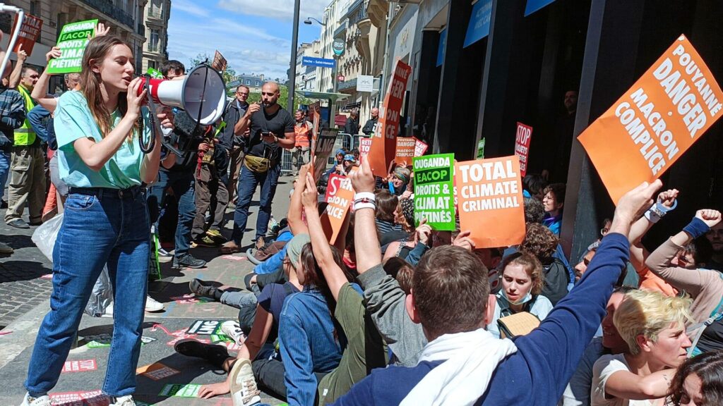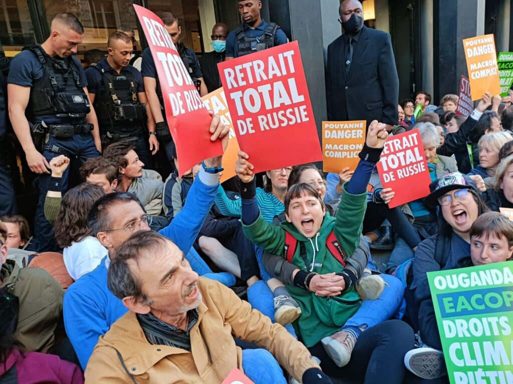 Ces derniers mois, la colère grandit vis-à-vis de la major pétrolière. TotalEnergies a annoncé son intention d’atteindre la neutralité carbone (soit l’équilibre entre le CO2 rejeté par ses activités et celui qu’elle peut stocker) à l’horizon 2050. Mais elle continue d’investir massivement dans l’expansion de projets gaziers et pétroliers. À l’heure actuelle, 70 % des investissements de la multinationale sont dédiés aux énergies fossiles et 20 % à l’exploration de nouveaux projets (Reclaim Finance). À ce titre, une mobilisation mondiale se coordonne peu à peu contre le développement par TotalEnergies de nouveaux projets pétroliers ou gaziers, notamment au Mozambique, ainsi qu’en Ouganda, où l’entreprise prévoit d’implanter l’« EACOP », le plus long oléoduc chauffé au monde (1 445 kilomètres, soit à peu près la distance entre Paris et Séville) et de forer 400 puits de pétrole au sein d’une réserve naturelle.
