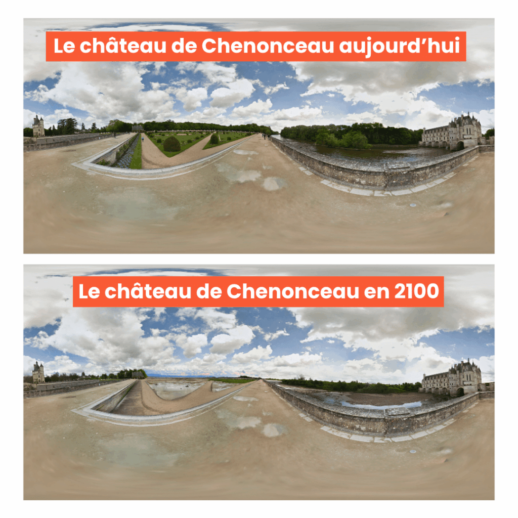 Le jeu Futureguessr, développé par le Réseau action climat et le studio Artefact 3000, permet de se projeter dans l’avenir de lieux emblématiques à horizon 2100, comme le château de Chenonceau. © Futureguessr/Montage Vert