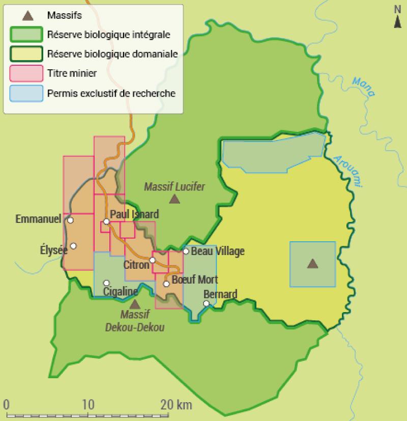 Depuis plusieurs années, la compagnie russo-canadienne Montagne d’Or (CMO) envisage d’ouvrir une mine d’or à ciel ouvert d’au moins 2,5 kilomètres de long sur 400 mètres de large et plus d’une centaine de mètres de profondeur en bordure de la Réserve biologique intégrale de Lucifer Dékou-Dékou, au nord-ouest de la Guyane.