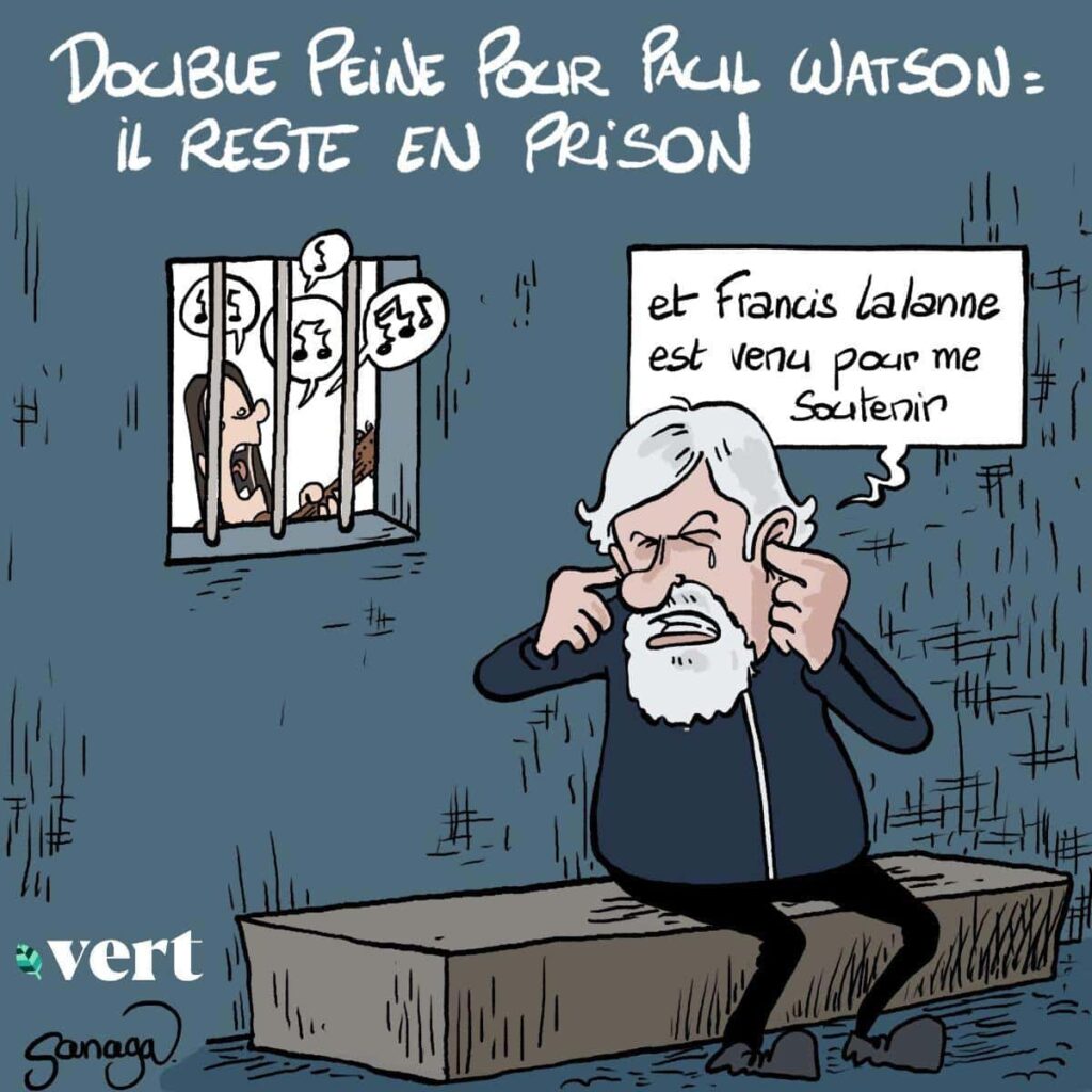 Mauvaise baleine. Le défenseur des cétacés Paul Watson est enfin sorti de prison, le 17 décembre dernier, au terme de 149 jours de détention au Groenland qui n’ont pas été de tout repos. Le fondateur de Sea Shepherd, que le Japon accuse de violences prétendument commises en 2010, a reçu des soutiens de poids, dont celui de… Francis Lalanne, qui avait fait le déplacement jusqu’à lui fin septembre. «Je suis sûrement mieux écouté au Groenland qu’en France, où certains ne veulent plus être avec moi sur la photo», avait déploré le chanteur antivax et soutien de Dieudonné, qui martelait vouloir s’investir «personnellement» dans la libération de l’activiste. Un mois plus tard, l’artiste controversé avait publié une chanson inédite, «Le dernier mot», hymne à la libération du militant. Une initiative qui a eu le mérite d’inspirer Sanaga, le dessinateur de presse de Vert.