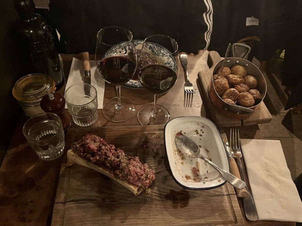 Trophées de chasse au mur, mobilier en bois rustique, doux fumet de viande et disque de Joe Dassin en fond : nous sommes bien dans l’un des 16 établissements du «Gueuleton, le repaire des bons vivants». Le menu est enveloppé dans une couverture en similicuir de vache. Les plus grosses pièces, allant jusqu’à 2 100 grammes de côtes de bœuf, sont plutôt prévues pour 3 ou 4 personnes, «mais même pour deux si vous avez faim, on ne vous jugera pas ici, on est bon vivants!», rassure le serveur. L’établissement, en plein cœur des cossus Ternes du 17ème arrondissement de Paris, a été l’un des petits derniers à ouvrir. C’était en mai 2023, cette fois-ci nulle part ailleurs que dans la capitale.