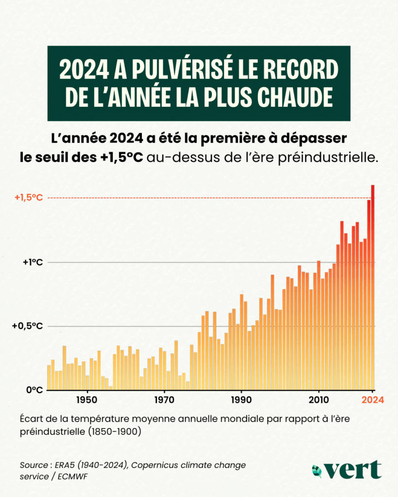 L’année 2024 a été marquée par une aggravation des impacts du changement climatique sur le territoire comme dans le monde entier. Elle a été l’année la plus chaude jamais mesurée sur la planète et a dépassé pour la première fois le seuil de +1,5 degré (°C) de réchauffement par rapport à la période préindustrielle (deuxième moitié du 19ème siècle) – soit l’objectif de l’Accord de Paris pour le climat (scellé en 2015) pour limiter les conséquences du changement climatique.