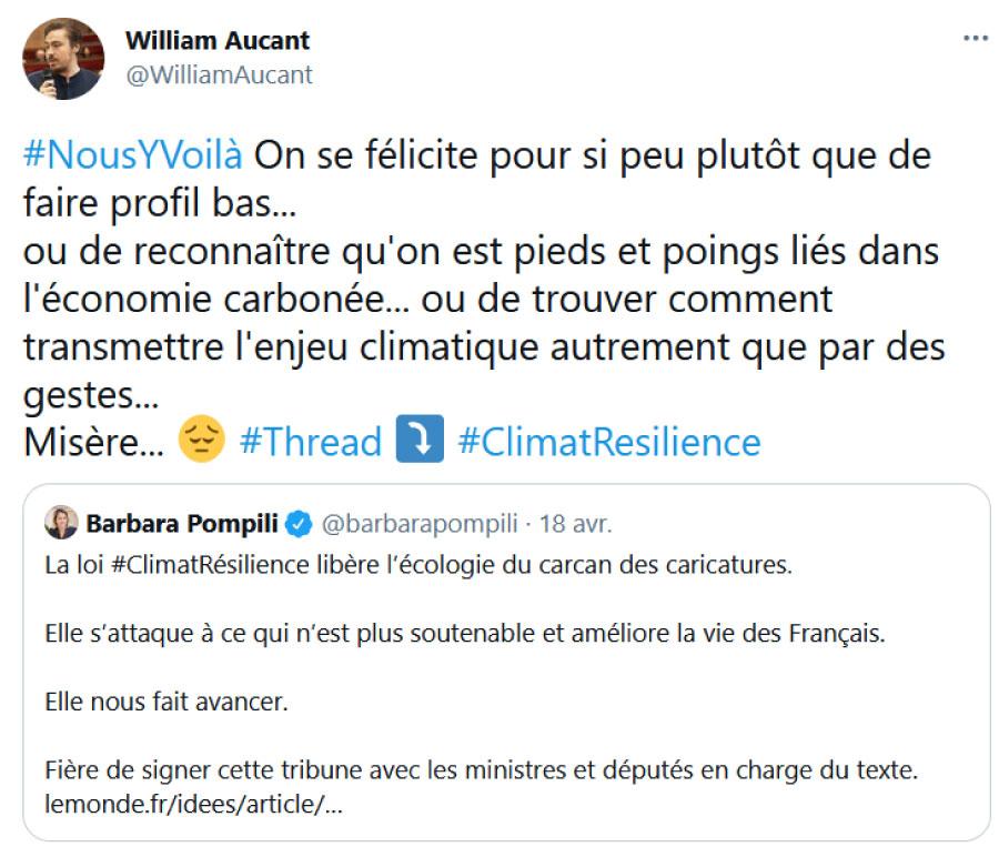 Ce qui n’a pas empêché plusieurs ministres (Barbara Pompili – écologie, Julien Denormandie – agriculture, Jean-Baptiste Djebbari – transports) de s’autocongratuler dans les colonnes du Monde, plutôt que de faire « profil bas », comme le voudrait William Aucant, membre de la Convention qui dénonce « un cynisme effroyable ».