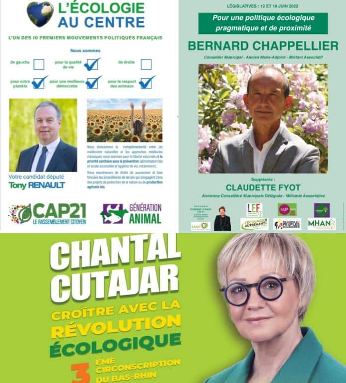 Quelque 250 candidat·es aux législatives sont soutenu·es par un rassemblement écologiste qui s’oppose à la Nouvelle union populaire écologique et sociale (Nupes). Une mobilisation en partie initiée par Corinne Lepage, ex-ministre de l’environnement d’Alain Juppé et présidente-fondatrice du parti Cap21, et Jean-Marc Governatori – candidat malheureux à la primaire écologiste dont il avait fini bon dernier – à la tête du mouvement L’écologie au centre. La coalition inclut plusieurs mouvements tels que Génération animal, Liberté Écologie Fraternité ou encore le Mouvement des progressistes.
