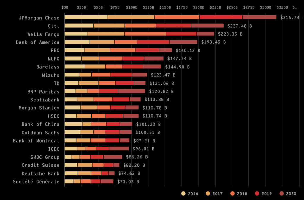 Les financements (sous la forme de prêts, ou d’émissions d’actions et d’obligations) ont augmenté de 6% entre 2016 et 2020 pour atteindre un total de 3,8 milliards de dollars (3,22 Mds€). En tête du classement : les Américaines JPMorgan Chase, Citi, Wells Fargo et Bank of America.