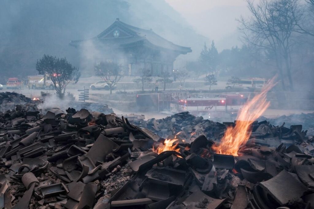 À Byeongsan Seowon (une ancienne académie confucéenne), des camions de pompiers ont projeté de l’eau et des produits ignifuges (qui résistent au feu) sur le site historique, dans un effort désespéré pour le sauver. «Nous pulvérisons trois tonnes d’eau chaque jour pour prévenir les incendies sur l’ensemble du site, y compris les bâtiments», a indiqué Lee Seung-myung, chef de l’équipe de sécurité incendie des pompiers d’Andong. Mais Choi Young-ho, un pompier, prévient : «S’il y a un vent fort, il transportera les flammes de loin, ce qui est très inquiétant.»
