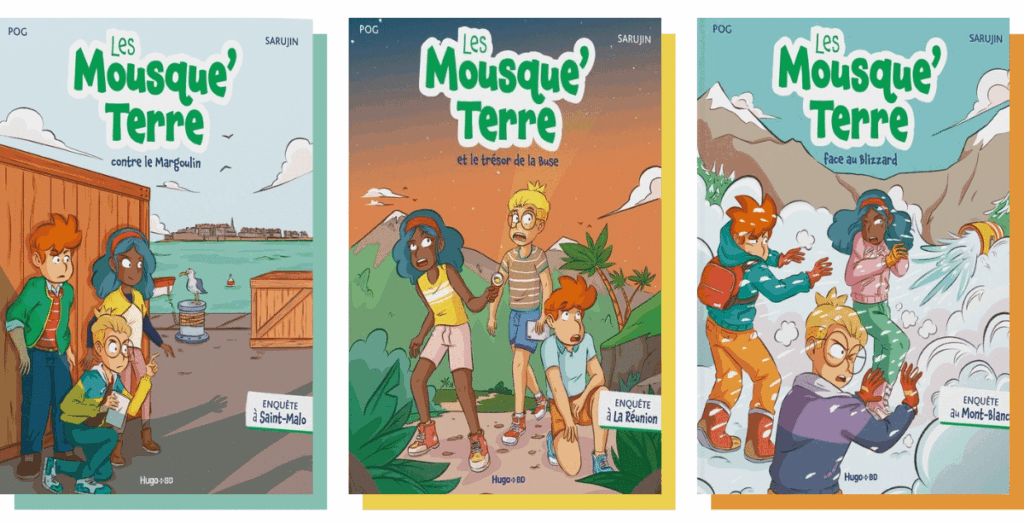 Tort tue. Dans cette série de BD destinée aux 7-10 ans, le duo Pog-Sarujin nous fait voyager en compagnie des jeunes membres d’une association «dont le but est de sauver la planète». Pour leur première mission, Léo, Bianca et Thimoté, âgé·es de neuf à dix ans, mettent le cap sur Saint-Malo. Ces apprentis Sherlock défenseur·ses de la planète ont reçu une étrange vidéo venue d’une informatrice anonyme : un commerce illégal d’animaux sauvages prospèrerait dans la cité corsaire. Alors, la bande se met en quête de ces trafiquants d’hermines, de perroquets et de tortues marines. Non sans mal… L’épisode 2, Les Mousque’Terre et le trésor de la Buse, nous amène à La Réunion pour une nouvelle aventure, liée à la première, qui met l’accent sur la préservation des récifs coralliens. Dans le numéro 3, «Face au blizzard», sorti en septembre, les enquêteur·ices prennent de la hauteur, direction le Mont-Blanc.