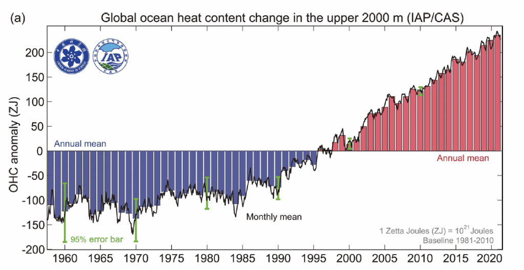 L’année 2021 fut la cinquième année la plus chaude jamais enregistrée en ce qui concerne la température atmosphérique (Vert). Mais dans les océans, l’année dernière s’est hissée sur la première marche du podium, selon une étude publiée mardi dans la revue Advances in Atmospheric Sciences. Jusqu’à 2 000 mètres de profondeur, les océans ont absorbé au moins 14 zettajoules de plus qu’en 2020, soit 14 000 milliards de milliards de joules, une unité qui sert à quantifier l’énergie et la chaleur. Ce qui équivaut à 145 fois la production mondiale d’électricité de l’année 2020. Selon les scientifiques, aucune variation climatique naturelle comme La Niña n’est en cause. C’est bien le changement climatique d’origine anthropique qui en est responsable.