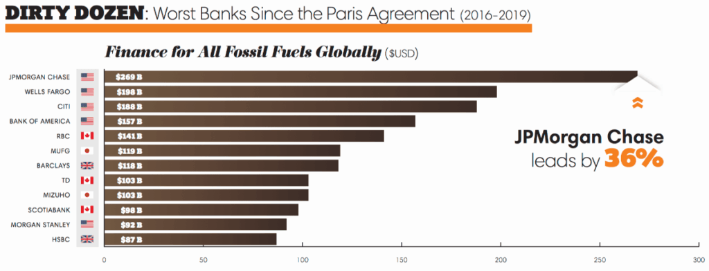 Dans un rapport publié mercredi 19 mars, plusieurs ONG – dont le Rainforest action network – ont établi un palmarès des financeurs les plus sales. Largement en tête, JP Morgan Chase a sponsorisé les énergies fossiles à hauteur de 244 milliards d’euros entre 2016 et 2019. Elle est suivie par trois compatriotes américaines : Wells Fargo, Citi, Bank of America. Celles-ci ont notamment multiplié les financements aux projets gaziers et pétroliers par fracturation hydraulique.