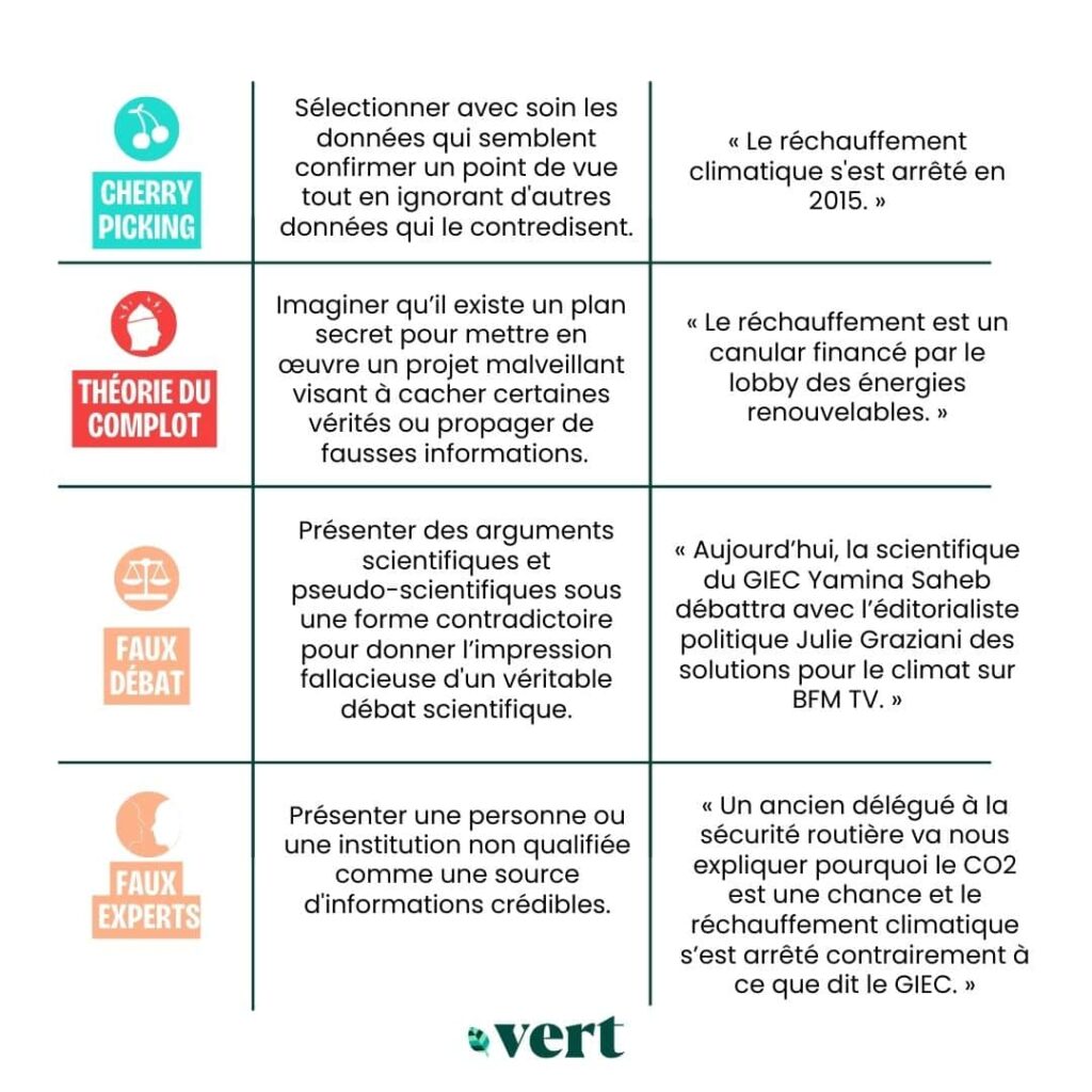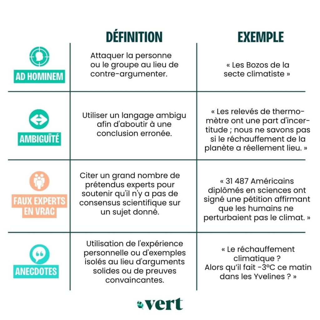 | Faux experts | Présenter une personne ou une institution non qualifiée comme une source d’informations crédibles. | « Un urologue spécialiste de l’intelligence artificielle s’élève contre le consensus, affirmant que les changements climatiques actuels ne sont qu’un phénomène parfaitement naturel. » |