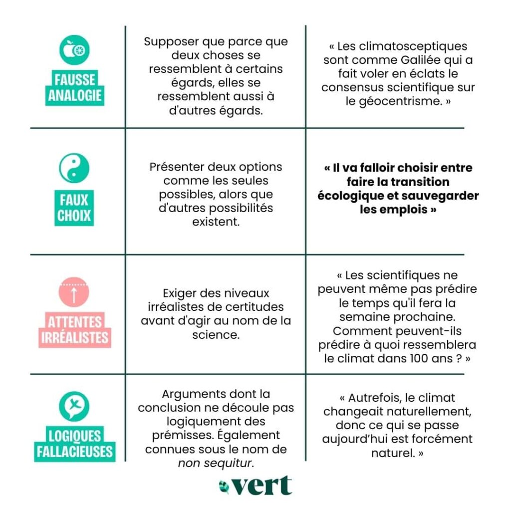 | Logique fallacieuse | Arguments dont la conclusion ne découle pas logiquement des prémisses. Également connues sous le nom de non sequitur. | « Autrefois, le climat changeait naturellement, donc ce qui se passe aujourd’hui est forcément naturel. » |