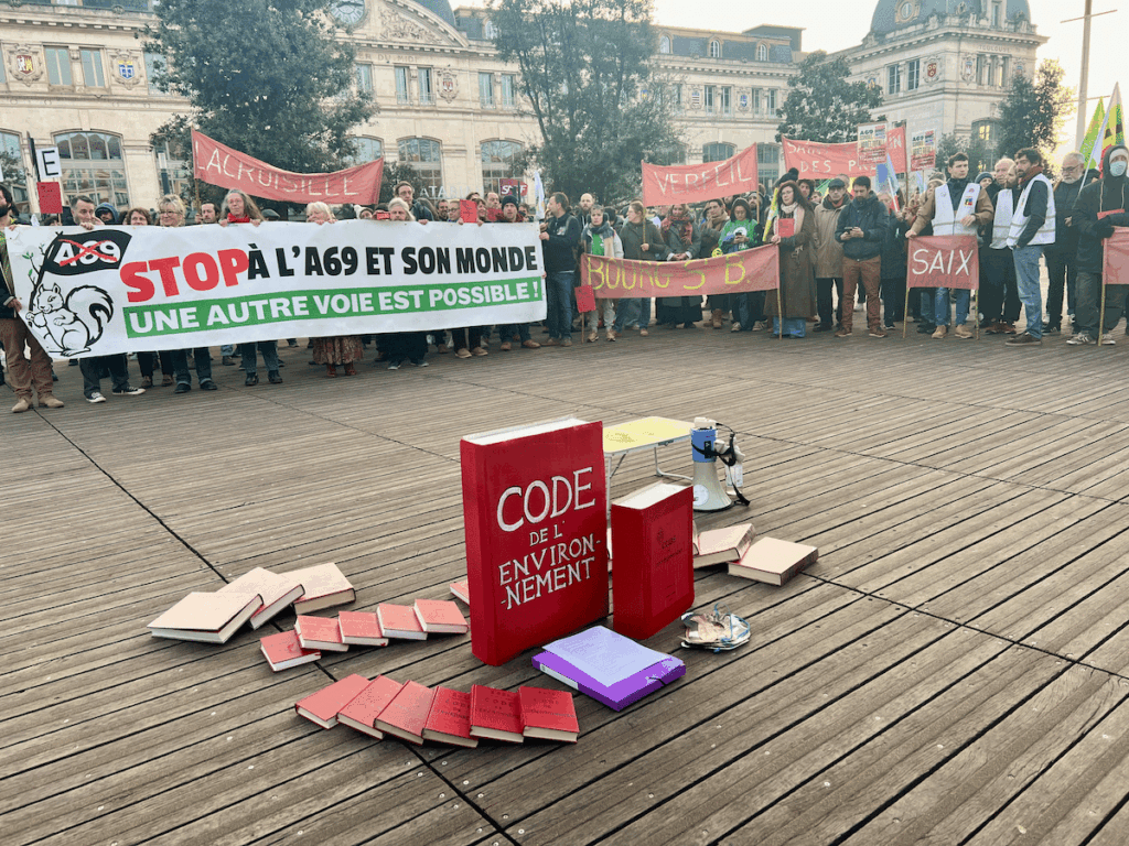 «Stop A69, la justice au pied du mur», «SOS chantier illégal», «Lutter c’est bon pour la santé» : de nombreuses pancartes et banderoles ont coloré le parvis de la gare de Toulouse-Matabiau, à quelques mètres du tribunal administratif, ce mardi matin. Les quatorze organisations à l’origine du recours (dont France nature environnement, Attac, la Confédération paysanne, les Amis de la Terre, et d’autres) avaient organisé un rassemblement de soutien avant le début de l’audience. Plus de 200 personnes ont répondu à l’appel, rassemblées autour de nombreux Codes de l’environnement éparpillés par terre. Elles scandaient le slogan «No macadam», devenu un emblème de la lutte contre l’A69.