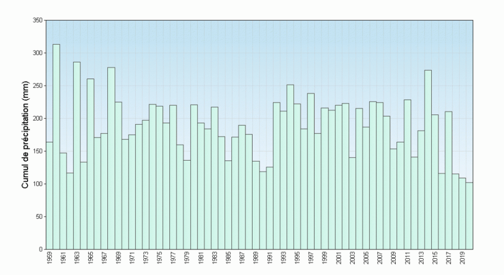 Cumul des précipitations estivales (21 juin au 20 septembre) en France depuis 1959 © Météo France