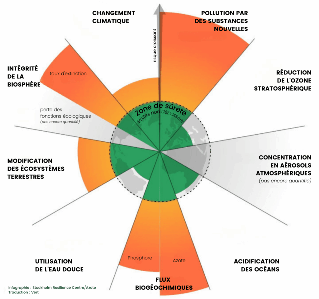 Au total, neuf limites ont été répertoriées : le changement climatique (la concentration de CO2 doit rester inférieure à 350 parties par million – PPM – dans l’atmosphère), l’érosion de la biodiversité (mesurée en disparition d’espèces et en perte des fonctions écologiques), la modification des usages des sols, la perturbation des cycles de l’azote et du phosphore, l’utilisation d’eau douce (inférieure à 4 000 km3/an), la diminution de la couche d’ozone, l’acidification des océans, la concentration des aérosols atmosphériques et, enfin, la pollution chimique. Les quatre premières limites sont déjà considérées comme franchies à des niveaux divers. Par exemple, la teneur de l’atmosphère en CO2 s’établit déjà aux environs de 420 ppm.