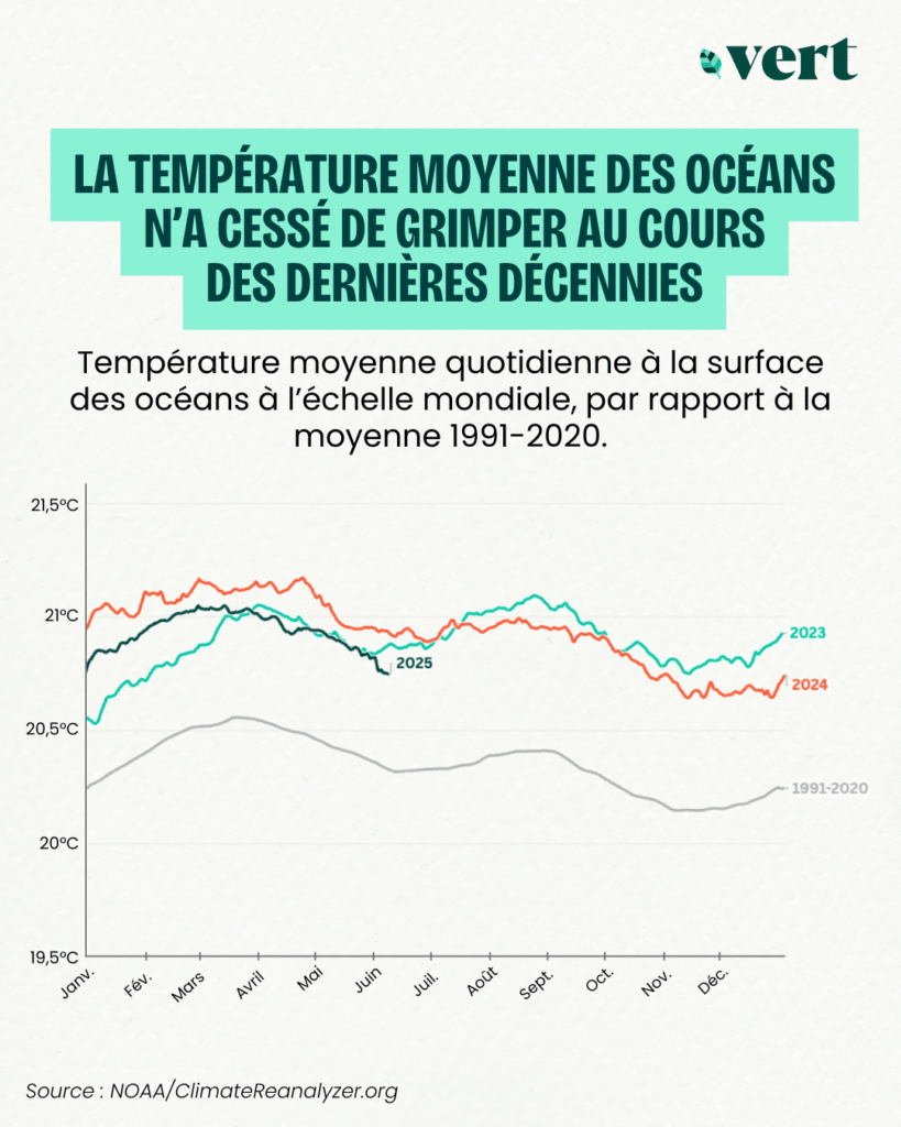 La Terre se réchauffe rapidement… et les océans, qui stockent quelque 90% de l’excès de chaleur généré par le dérèglement du climat, ne sont pas en reste. Dans le dernier rapport du Giec, on considérait que l’océan s’était réchauffé de 0,88°C entre la période 1850-1900 et la décennie 2011-2020. Cette hausse s’élève désormais à +1,02°C, si l’on considère les données des dix dernières années (2015-2024).