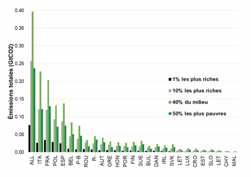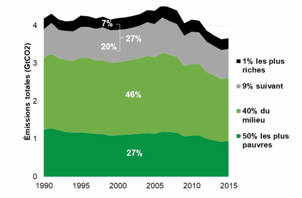 Pendant cette période, le total des émissions annuelles liées à la consommation des 50 % les plus pauvres a baissé de 24 % et celui des 40 % ayant des « revenus moyens », de 13 %. Dans le même temps, les émissions des 10 % les plus riches ont augmenté de 3 %.