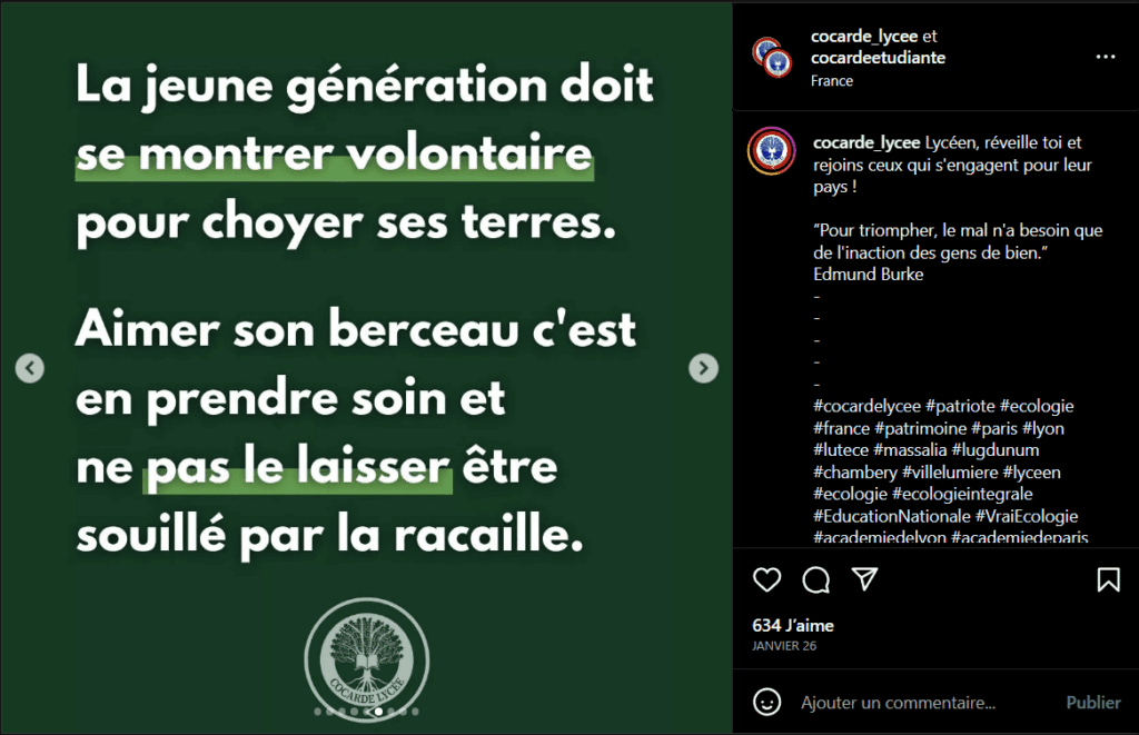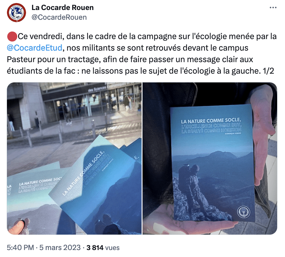 Devant l’université Paris 2 Panthéon-Assas, un petit groupe d’étudiant·es distribue des tracts entièrement verts. Au premier plan, un randonneur y admire la beauté d’un paysage de montagne. L’œuvre d’étudiant·es écolos ? La promotion d’une campagne de pèlerinage ? En réalité, il s’agit de tracts annonçant la campagne «écologique» de La Cocarde, syndicat étudiant qui fournit de nombreux collaborateurs du Rassemblement national.