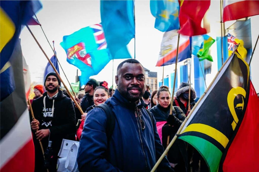 Le poing serré sur la hampe en bambou, Lorenzo Raplili est « fier » de porter le drapeau de Vanuatu ce samedi après-midi, à travers les rues de Glasgow. Peuplé d’habitants « chaleureux » qui « aiment l’environnement et l’espèce humaine », l’archipel de quatre-vingt îles situé dans l’Océan Pacifique est « classé comme étant le second endroit le plus heureux sur Terre », précise-t-il. Hélas, la nation est aussi l’une des plus vulnérables au changement climatique. « Avec la montée de l’océan, les gens sont déplacés des côtes vers les collines, raconte Lorenzo, l’œil brillant. Les sécheresses endommagent l’agriculture, et nous font perdre nos moyens de subsistance. Nous avons le droit à la nourriture ».