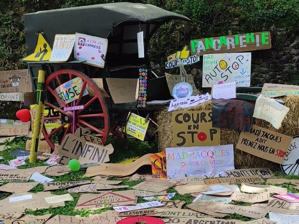 Il est 6h45 ce samedi matin lorsque, tous deux sorti·es d’une maison en Mayenne avec nos gros sacs à dos, nous brandissons nos pancartes préparées la veille : «Course en stop – Creuse». Notre objectif : atteindre Cheniers, village de 500 habitant·es au nord de la Creuse pour participer à la Mad Jacques. Plus de 2 000 autres équipes sont parties de toute la France (et même de la Belgique) pour prendre part à cette course destinée à encourager la pratique du stop.