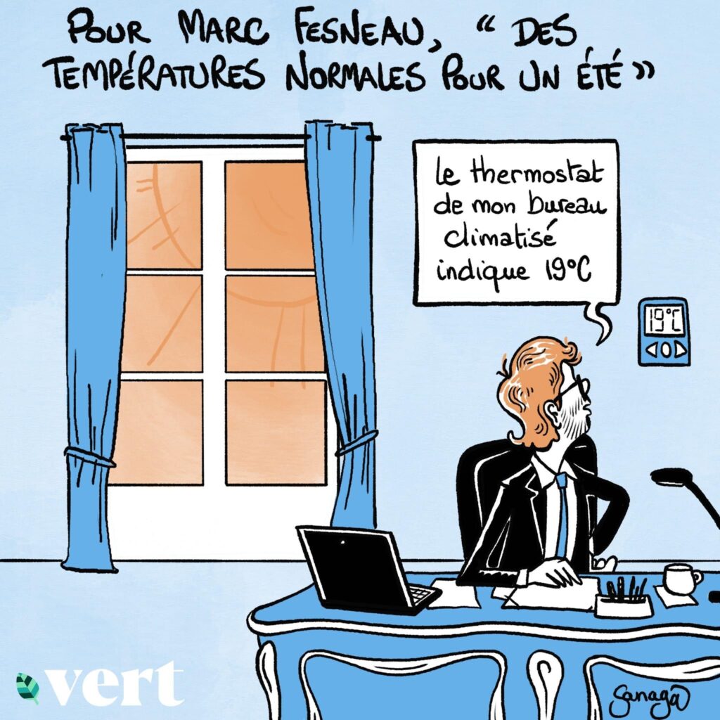 Une erreur que n’ont pas laissé passer les spécialistes du sujet ainsi que notre dessinateur Sanaga : le mois de juin fut en réalité le deuxième plus chaud jamais enregistré dans le pays, situé 2,6 °C au-dessus des normales, comme l’a rappelé la paléo-climatologue et co-présidente du Giec Valérie Masson-Delmotte. Elle, qui avait tenu un séminaire de rentrée sur le climat devant le gouvernement au mois de septembre dernier pourra visiblement recommencer.