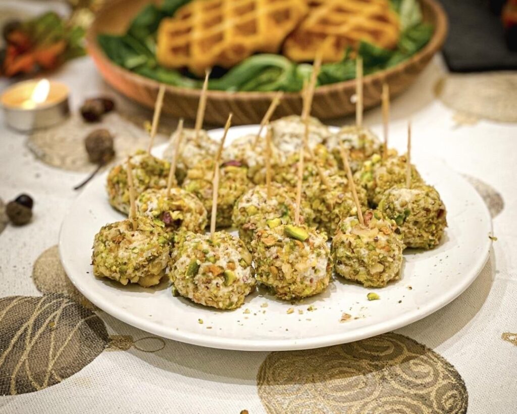 Ce n’est pas parce que le menu de Noël est végane qu’il n’y a pas de fromage sur la table. À la place du traditionnel plateau, les deux cheffes proposent de déguster de petites sucettes à base de noix et d’éclats de pistache.