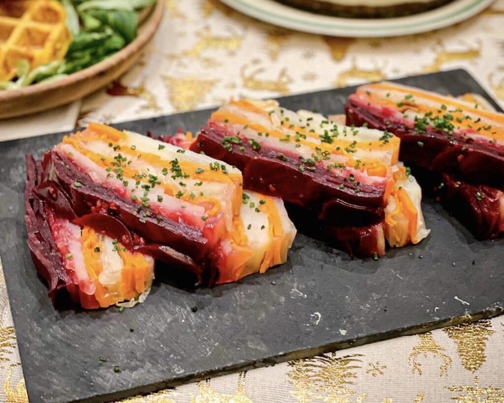 La note de Mélanie : «Tout le monde connaît le goût de la betterave, de la carotte ou de la pomme de terre. Nous voulions donc partir de ces ingrédients simples et leur offrir une nouvelle dimension, les redécouvrir en nous inspirant du visuel du pâté en croûte et des terrines. Le résultat : de belles tranches de légumes de saison, à la fois colorées et festives, qui mettent immédiatement dans l’ambiance des fêtes.»